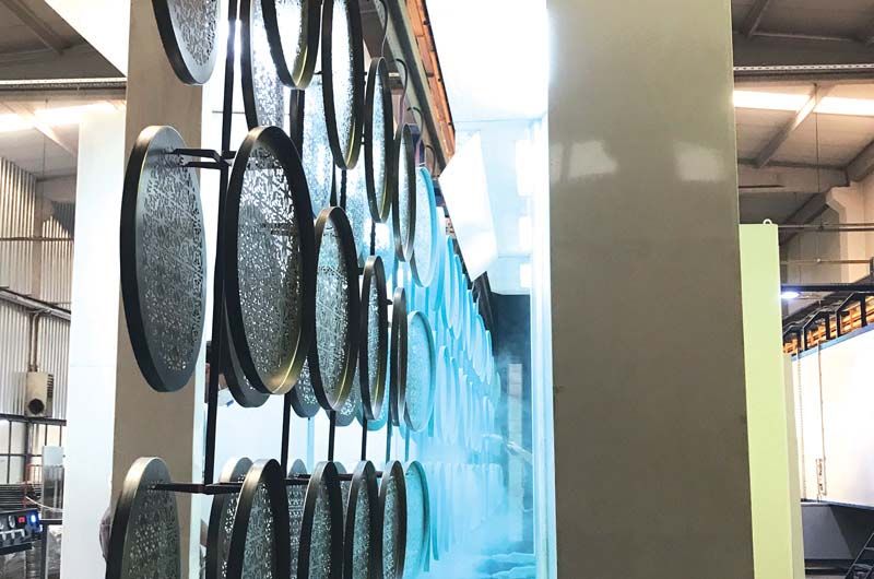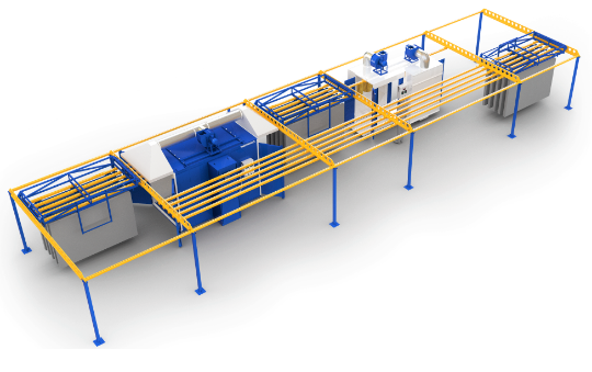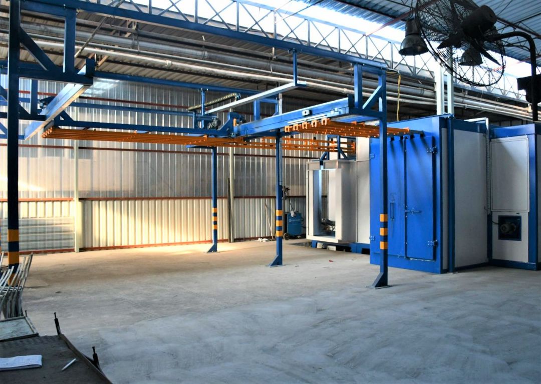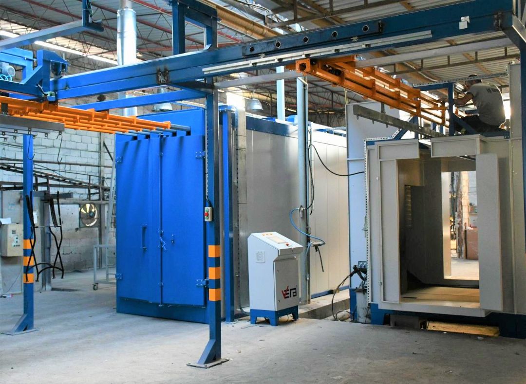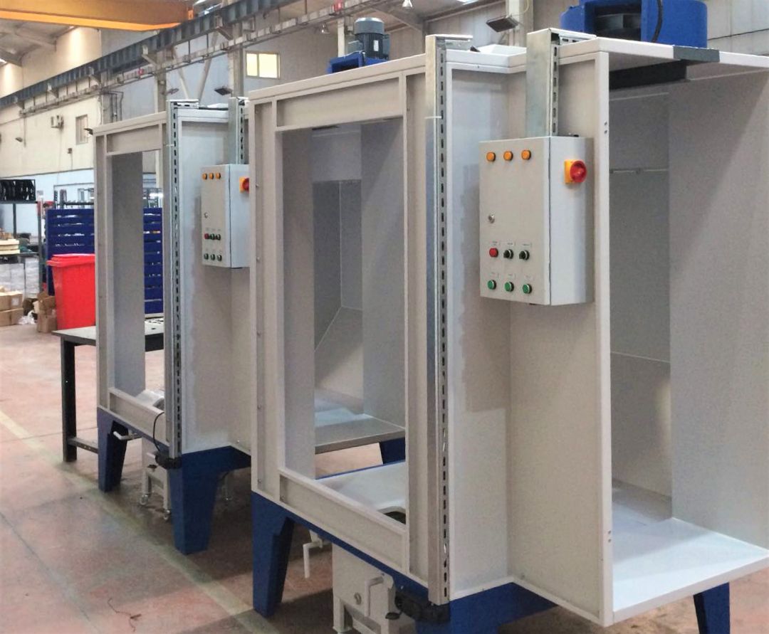 односторонние или двухсторонние камеры напыления, с системой вытяжки воздуха и рекуперации порошковой краски, бункеры сборники краски со встроенными виброситами устанавливаются под блоками фильтров с каждой стороны, ручные установки нанесения краски, а также транспортные системы разной грузоподъемности, для перемещения окрашиваемых и готовых изделий.